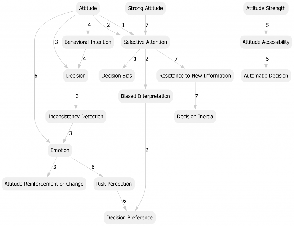 This section outlines mechanisms that have been proposed to explain the influence of attitude on decision making behavior. The diagram below visualizes the mechanisms through variables and labeled edges reflecting the rules used to describe each mechanism. Labels match section numbers below.