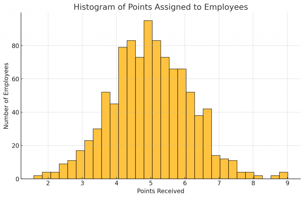 • Points Per Employee \( C \): Higher \( C \) increases the total number of points distributed and can smooth the distribution, as employees have more flexibility in allocation.